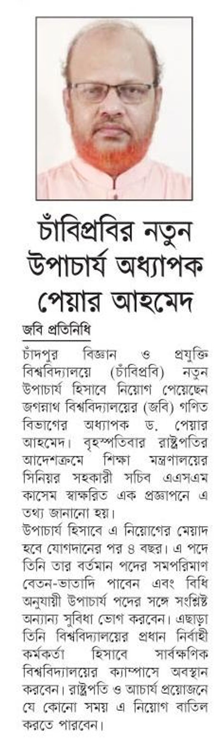 চাঁদপুর বিজ্ঞান ও প্রযুক্তি বিশ্ববিদ্যালয়ে (চাঁবিপ্রবি) নতুন উপাচার্য হিসাবে নিয়োগ পেয়েছেন জগন্নাথ বিশ্ববিদ্যালয়ের (জবি) গণিত বিভাগের অধ্যাপক ড. পেয়ার আহমেদ। বৃহস্পতিবার রাষ্ট্রপতির আদেশক্রমে শিক্ষা মন্ত্রণালয়ের সিনিয়র সহকারী সচিব এএসএম কাসেম স্বাক্ষরিত এক প্রজ্ঞাপনে এ তথ্য জানানো হয়।