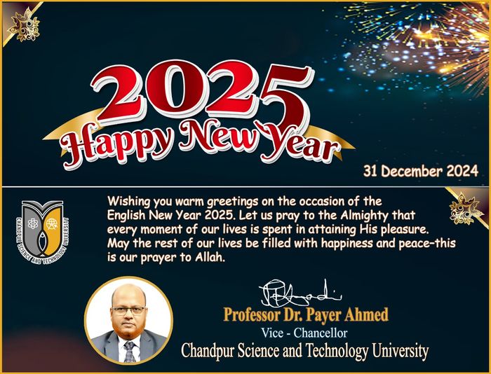 চাঁদপুর বিজ্ঞান ও প্রযুক্তি বিশ্ববিদ্যালয়ের মাননীয় ভাইস-চ্যান্সেলর অধ্যাপক ড. পেয়ার আহম্মেদ নতুন বছরে বিশ্ববিদ্যালয়কে বিশ্ব দরবারে এক অনন্য উচ্চতায় দাঁড় করানোর প্রত্যয় ব্যক্ত করেন।
